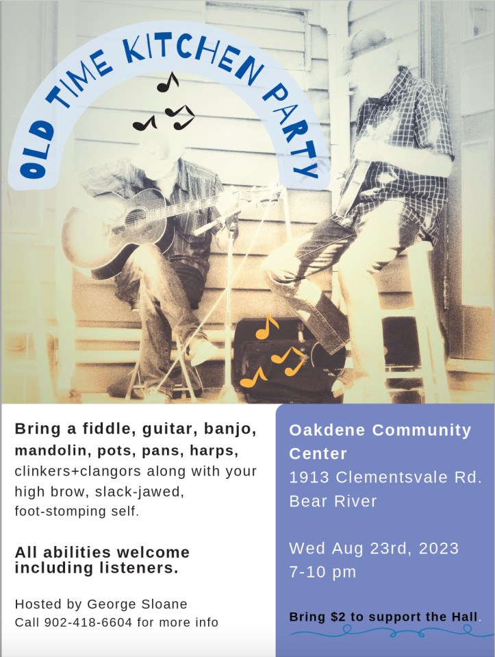 Come one, Come all and join in Bear River’s old time kitchen party ..bring a fiddle, guitar, Banjo, mandolin, pots, pans, clinkers clangors,,harps along with your high brow, slack jawed, foot stomping, down home self . Don’t forget your cousins and relatives three times removed…