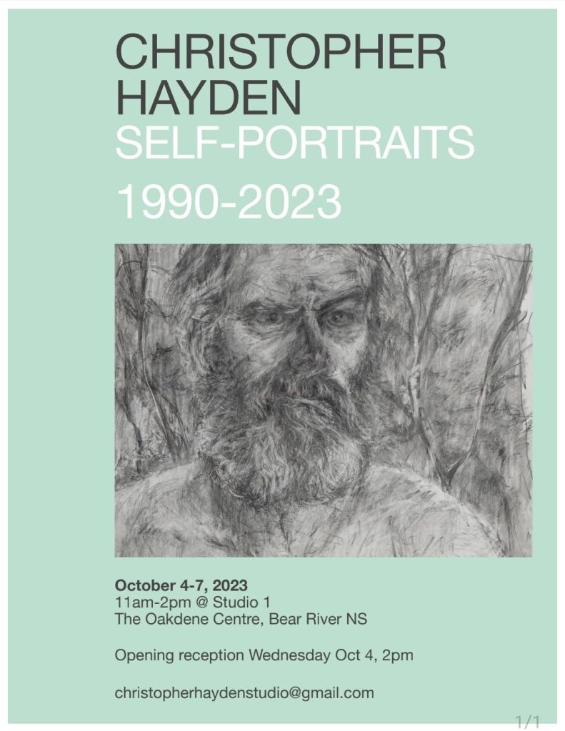 2023-10-01 Flora Doehler 2 Art Openings. Catherine Smith-Sculpture;Christopher Hayden- Self-Portraits and Photography. Oct 4, 2023 2 Artists, 3 Mediums, 2 Studios, 1 opening reception on Wed Oct 4, 2023 at 2pm at the Oakdene Centre, 1913 Clementsvale Road, Bear River. The show continues Thurs, Fri, Sat. Share this:Tweet Click to print (Opens in new window) Print Click to email a link to a friend (Opens in new window) Email Share on Tumblr Click to share on Reddit (Opens in new window) Reddit Like Loading... Related