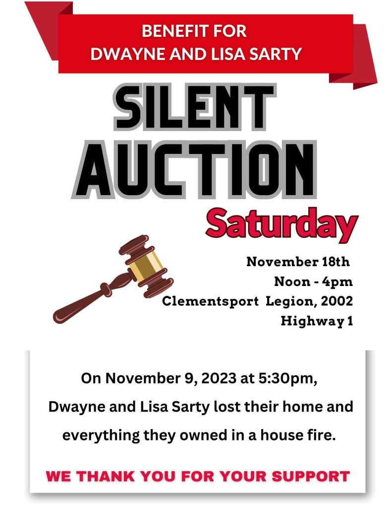 A devastating fire has leveled the house of Dwayne and Lisa Sarty. They and their two children must start again and to help them, Tina Mailman is organizing a silent auction for this coming Saturday afternoon at the Legion in Clementsport.