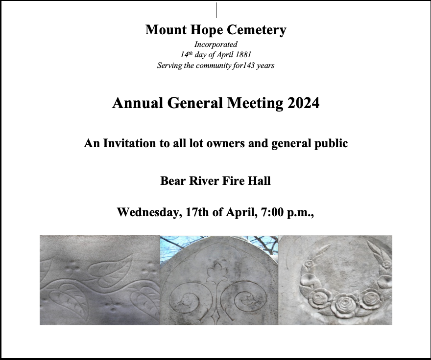 2024-04-12 Bear River Arts and Action Mount Hope Cemetery Meeting April 17, 2024 Mount Hope Cemetery Incorporated14 th day of April 1881Serving the community for 143 years Annual General Meeting 2024 An Invitation to all lot owners and general public Bear River Fire HallWednesday, 17th of April, 7:00 p.m. Share this:Tweet Click to print (Opens in new window) Print Click to email a link to a friend (Opens in new window) Email Share on Tumblr Click to share on Reddit (Opens in new window) Reddit Like Loading... Related