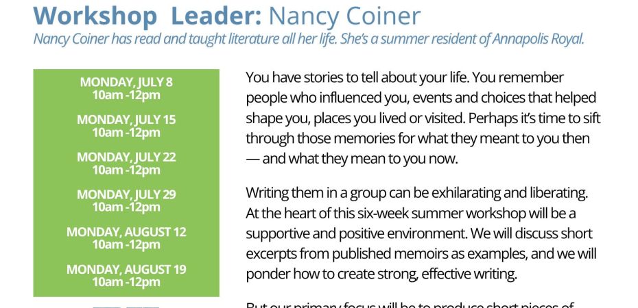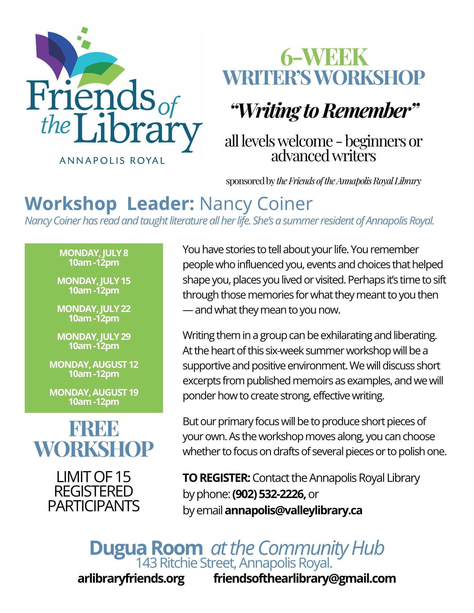 Is improving your writing on your summer to-do list? If so, please consider registering for our FREE workshop at the Annapolis Royal library. Our six week writer’s workshop is beginning July 8.