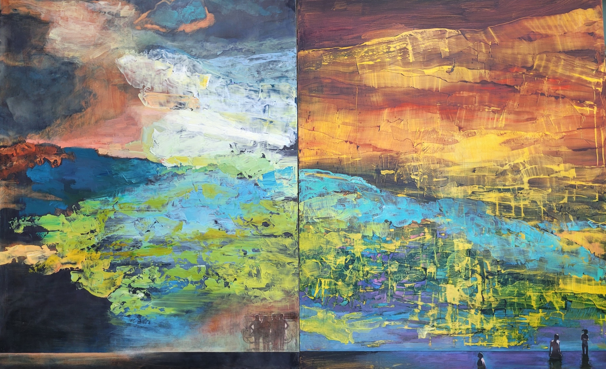 ‘Ruptured Landscapes’ is a solo exhibition of oil paintings by Nova Scotian artist Eva McCauley, exploring the relationship between people and our fragile environment, a world threatened by systematic disintegration and devastation. Her paintings explore and speak to climate change, particularly on oceans and shorelines: the sea level is rising, waters are warming, storms are intensifying, lives and communities are at risk. Conjured partly from memory, partly from photographs, the figures in the paintings uneasily inhabit places that are explored in the past and present, with a focus on their relationship to bodies of water.