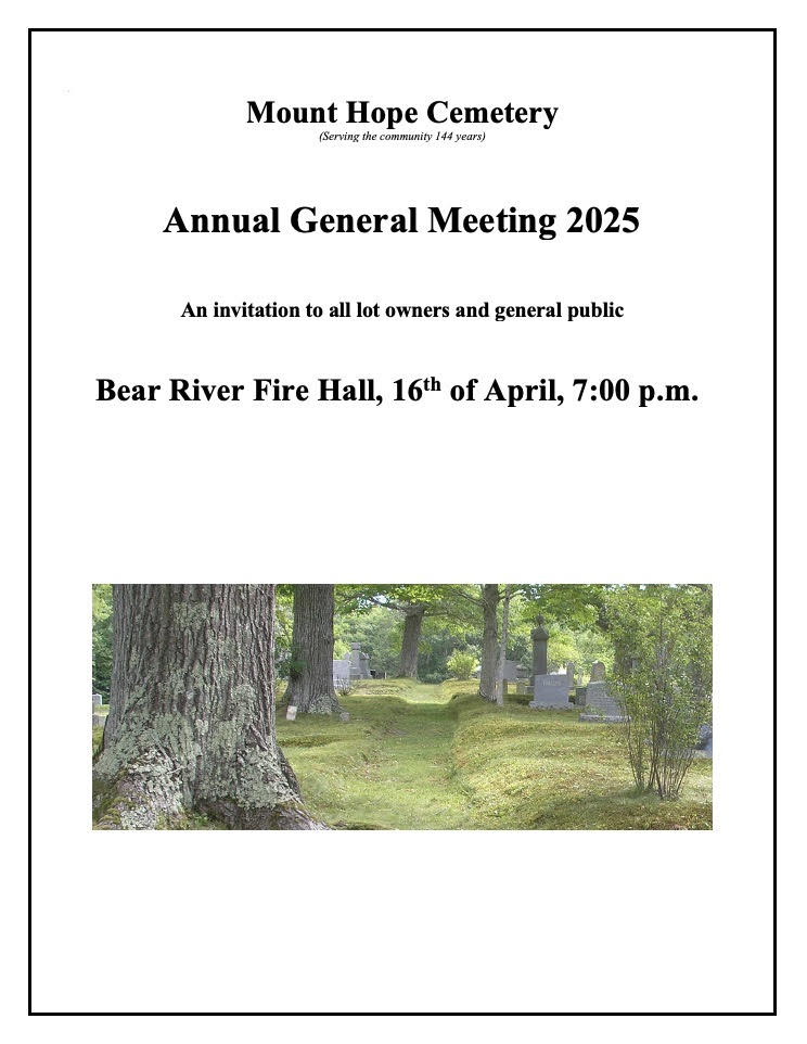 Mount Hope Cemetery in Bear River is holding its Annual General Membership meeting at the Firehall on April 16, 2025 at 7pm.