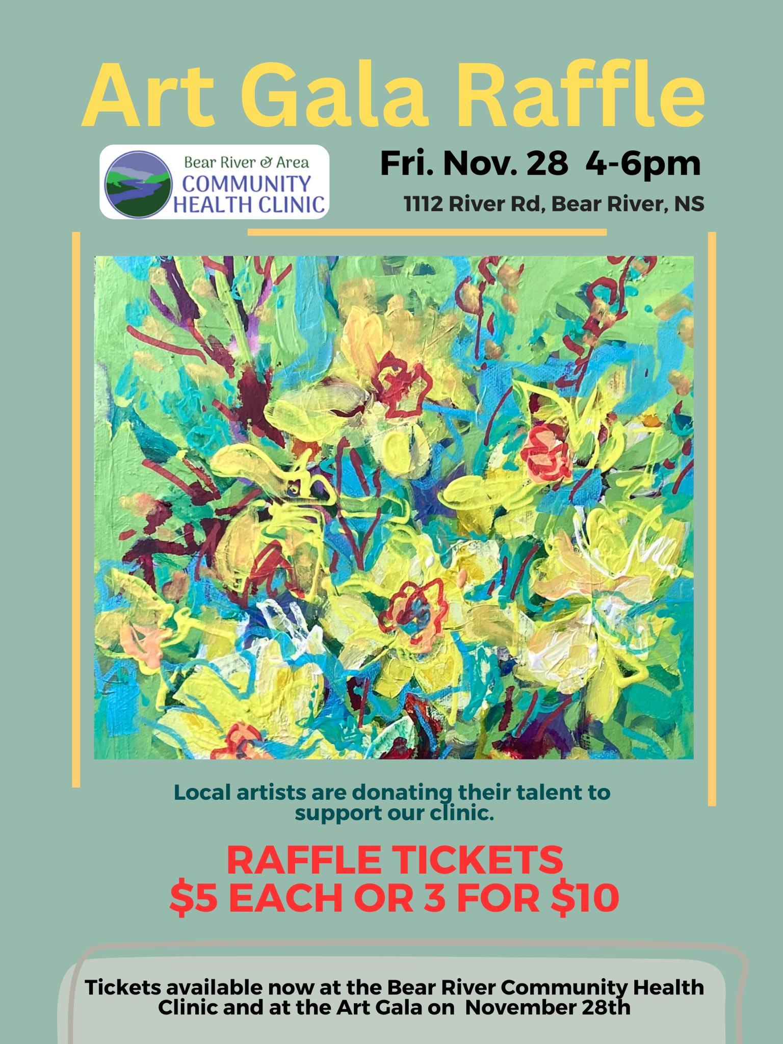 Here is your chance to win a piece of local art while supporting our village community Health Clinic. Friday is the final day to big on the 16 pieces of donated art. Drop in to buy your tickets throughout the day and stay for the meet and greet and nibblies from 4-6.