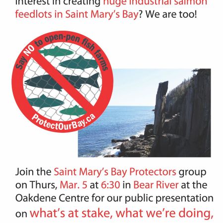 Important Meeting on Open Pen Fish Farms in Saint Mary’s Bay – Thurs. 6:30 pm Mar 5 at Oakdene Centre.